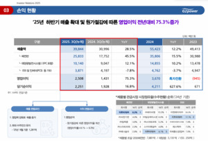 스마트그리드 솔루션 전문기업 지투파워가 올해 3분기 누적 실적에서 영업이익 75.3% 증가를 기록하며 실적 호조를 보였다.지투파워가 17일 공개한 IR 자료에 따르면 올해 3분기 누적 매출액은 398억원으로 전년 동기 대비 28.5% 증가했으며, 영업이익은 25억원으로 75.3% 급증했다. 전년 같은 기간 14억원이었던 영업이익이 두 배 가까이 늘어나며 수익성이 크게 개선됐다.영업이익률도 4.6%에서 6.3%로 1.7%포인트 상승했다. 당기순이익은 23억원으로 16.8% 증가했다.지투파워 관계자는 "관급 영업이 활성화되면서 배전반 매출이 45%, 태양광이 12% 증가하는 등 전체 매출 성장이 이뤄졌다"며 "작년부터 지속해온 원가절감 노력에 더해 매출 증가로 판관비 비중이 전체의 25% 수준까지 줄어들면서 수익성이 개선됐다"고 설명했다.향후 매출 가시성도 확보했다. 9월 말 기준 수주잔고는 1281억원으로 사상 최대치를 기록했다. 이는 2024년 연간 매출(554억원)의 2배가 넘는 규모로, 향후 2년 이상의 안정적인 일감을 확보했다는 의미다. 5개년 수주잔고 연평균 성장률은 55.04%에 달한다.신산업 진출도 본격화하고 있다. 지투파워는 올해 2월 신한울 3