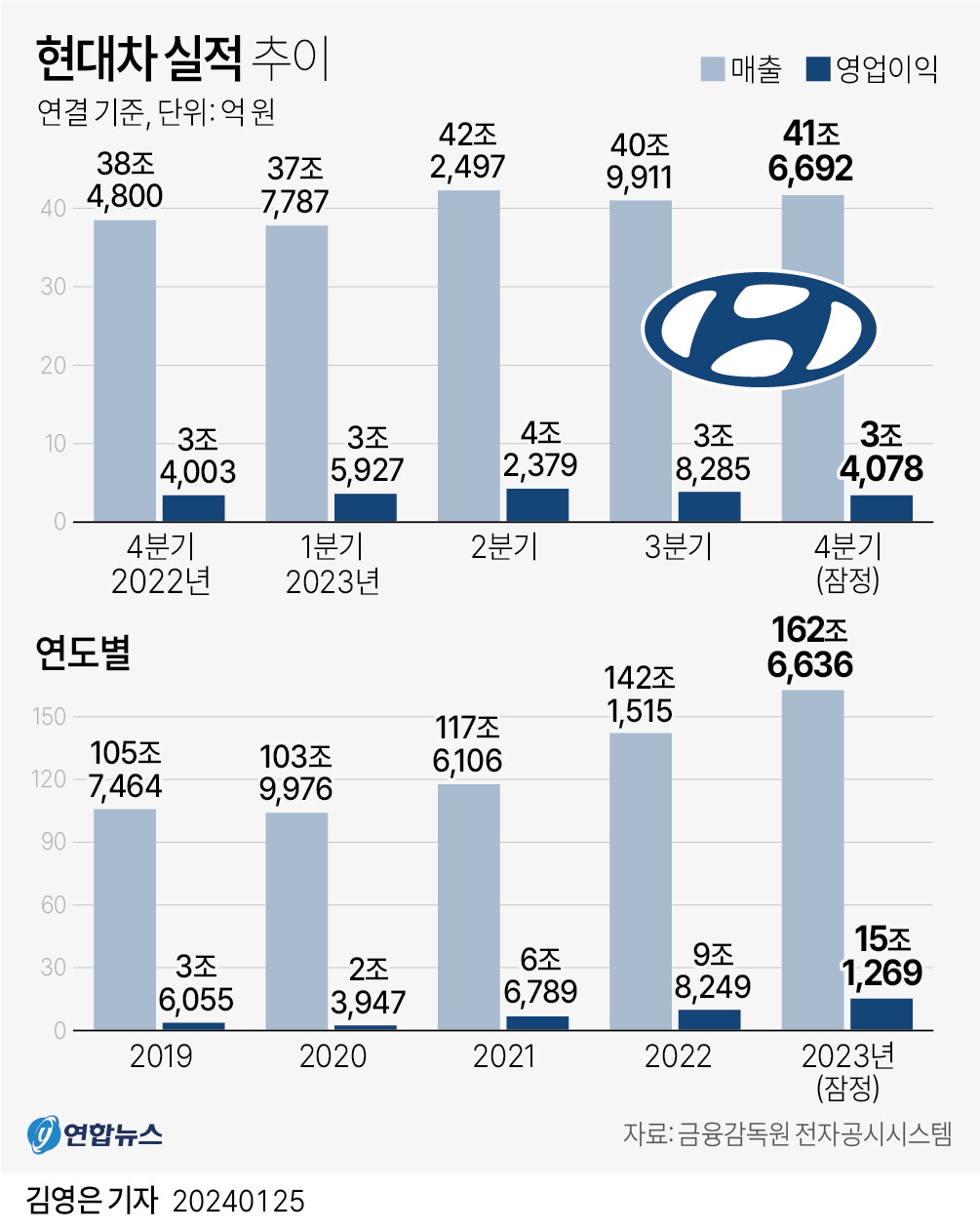 현대차 연간 영업이익이 15조원을 넘은 것은 이번이 처음이다. 연간 매출 160조원 돌파도 처음이다. 영업이익률은 9.3%로 나타났다.