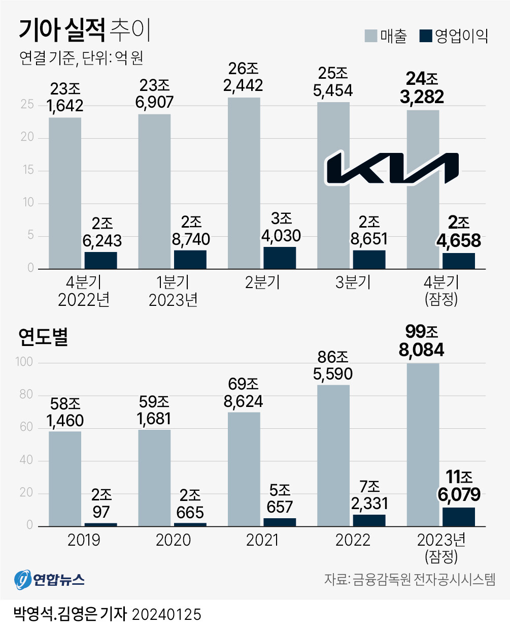 기아도 같은 날 지난해 연결 기준 매출액 99조884억원, 영업이익 11조679억원의 실적을 공시했다. 종전 최대 실적인 2022년 매출(86조5590억원)과 영업이익(7조2331억원)에서 각각 15.3%, 60.5% 상승했다.