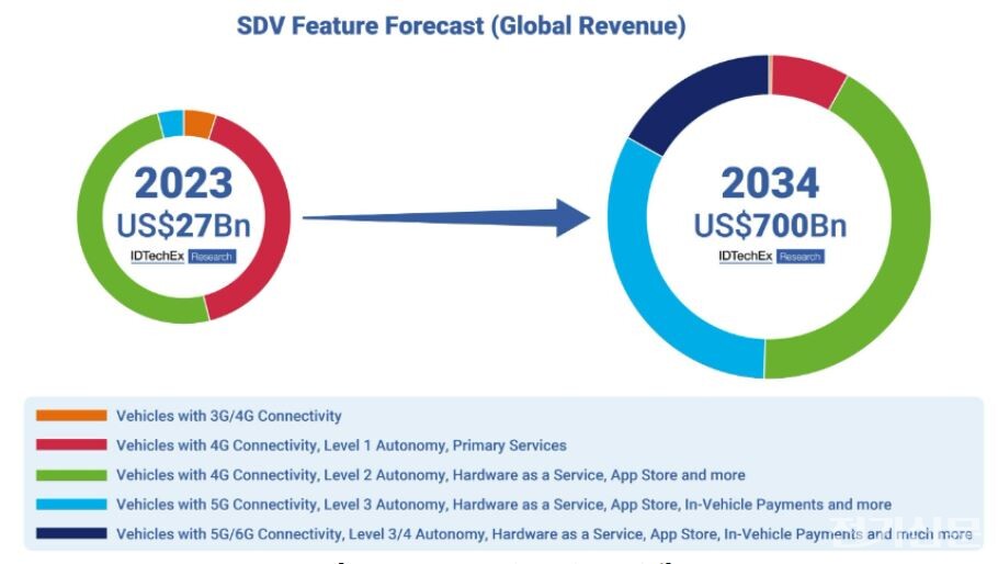 따라서 SDV 시장에 대한 전망도 매우 밝다. 글로벌 시장조사기관 ID TechEx에 따르면 2023년 270억달러(약 37조 3275억원)에서 연평균 34% 성장해 2034년에는 7000억달러(약 967조 7500억원)에 이를 것으로 전망된다.