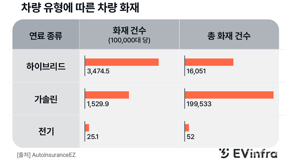 실제 미국 도로교통국(NHTSA) 보고서(2022)에 따르면, 전기차 화재 발생 비율은 10만 대당 25.1건으로, 하이브리드(3474.5건)와 가솔린(1529.9건)에 비해 낮았다.