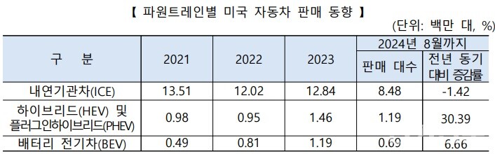 KOTRA가 지난 28일 발표한 ‘2024 美 대선 향방에 따른 자동차 산업 전망’ 보고서에 따르면 미국 자동차 시장이 뚜렷한 변화의 조짐을 보이고 있다. 2024년 8월까지의 판매 데이터를 보면 내연기관차는 전년 동기 대비 1.42% 감소한 848만대, 전기차는 6.6% 증가한 69만대를 기록했다. 반면 하이브리드 및 플러그인 하이브리드 차량은 30.39% 급증한 119만대를 기록하며 새로운 대안으로 부상하고 있다.