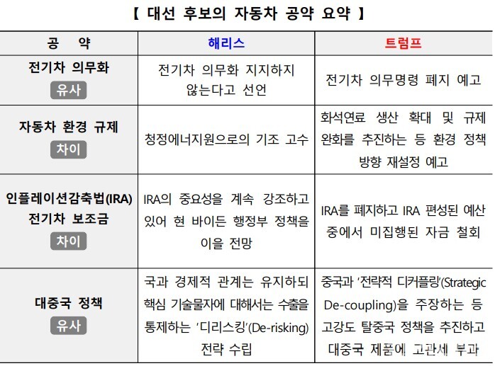 전문가들은 대선 결과에 따라 자동차 산업의 주요 정책이 크게 달라질 것으로 전망하고 있다. 해리스 후보는 기존 의무화 공약을 철회했고, 트럼프 후보는 소비자 선택권과 일자리 문제를 들어 전면 폐지를 선언했다. 보고서는 전기차 수요 감소와 일자리 문제를 고려할 때 차기 정부에서 의무화 정책이 실행되기는 어려울 것으로 전망되며, 이에 따라 일시적인 전기차 확산 속도 둔화는 불가피하다고 봤다.