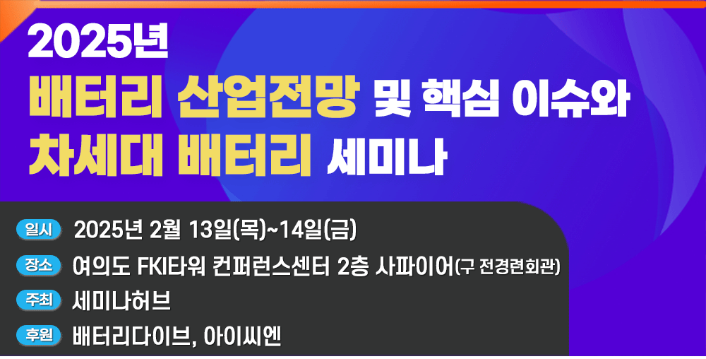 이에 세미나허브가 주최하고 배터리다이브와 아이씨엔이 후원하는 ‘2025년 배터리 산업 전망 및 핵심 이슈와 차세대 배터리 세미나’가 오는 2월 13일과 14일 양일간 여의도 전경련회관에서 개최된다.