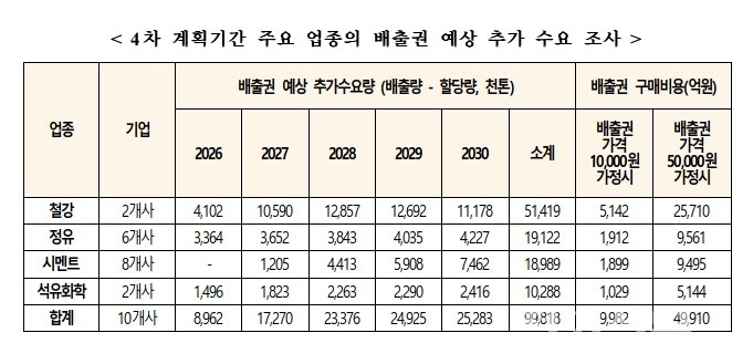 이를 배출권 가격을 5만원으로 가정해 계산 시, 4차 계획기간 동안 총 배출권 구매비용이 약 5조원에 달하며, 4개 업종의 일부 기업만 조사된 점을 감안했을때 산업계에서 과도한 탄소비용을 부담할 것으로 우려하고 있다.